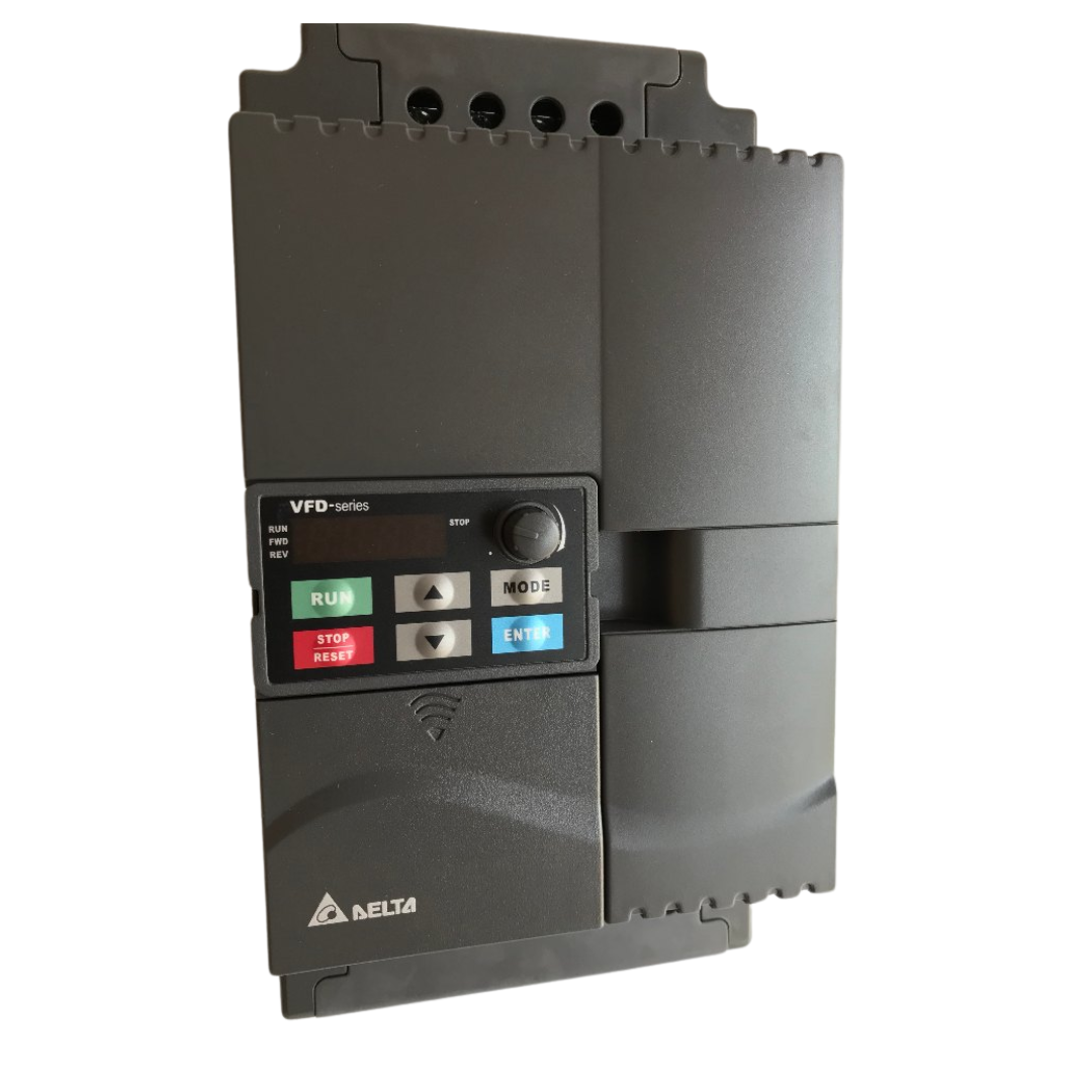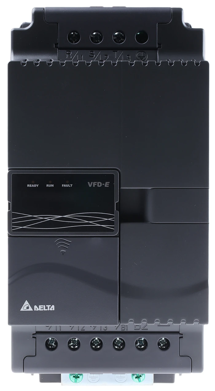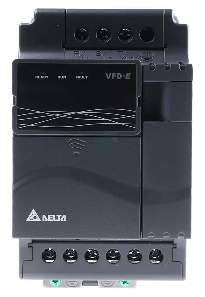 Delta E Series VFD 3 Phase (0.5–30 HP) – Built-in braking, vector control, RS-485. Models: VFD004E43A to VFD220E43A. Ideal for conveyors, pumps, HVAC.