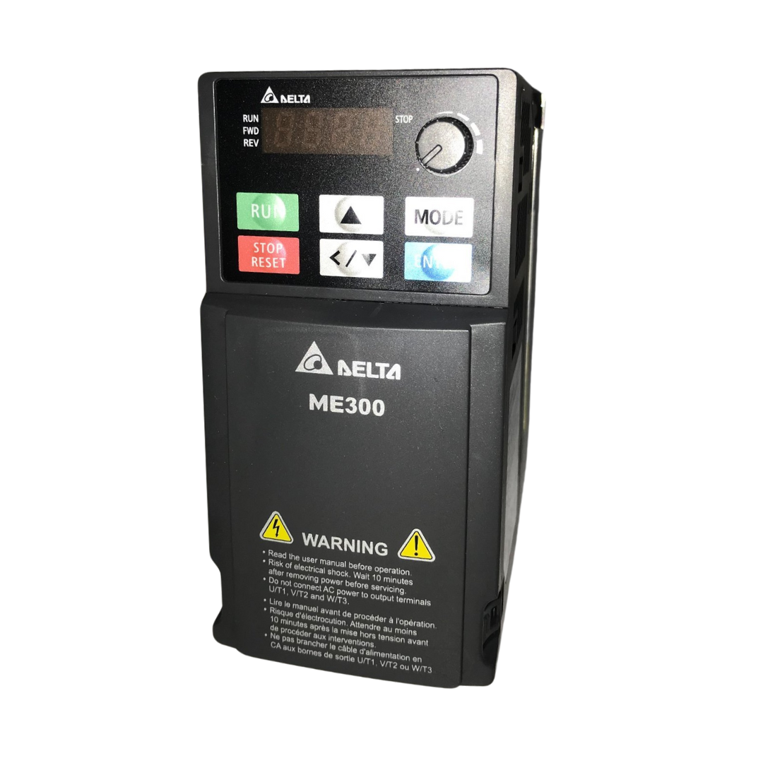 Delta ME300 VFD 1 phase models deliver 0.5–3 HP motor control with vector regulation, STO safety, built-in braking, and PID automation. Compact, efficient, and robust.